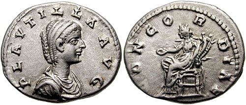 SEV-523   PLAUTILLA, wife of Caracalla. AR Denarius (3.17 gm). Laodicea mint. Struck 202 AD. PLAVTILLA AVG, Draped bust right / CONCORDIAE, Concordia seated left, holding patera in right hand, double cornucopiae in left. RIC IV 372; BMCRE 739; RSC 8.
