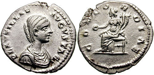 PLAUTILLA, wife of Caracalla. AR Denarius (3.02 gm). Laodicea mint. Struck 202 AD. PLAVTILLAE AVGVSTAE, Draped bust right / CONCORDIAE, Concordia seated left, holding patera in right hand, double cornucopiae in left. RIC IV 370; BMCRE 734; RSC 7.