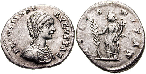 SEV-522   PLAUTILLA, wife of Caracalla. AR Denarius (3.42 gm). Laodicea mint. Struck 202 AD. PLAVTILLAE AVGVSTAE, Draped bust right / HIL-A-RITAS, Hilaritas standing left, holding long palm in right hand, double cornucopiae in left. RIC IV 371; BMCRE 737; RSC 14.