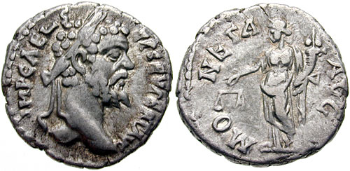 IMP CAE L S-EP SEV PERT AVG, laureate head right / MO-NETA AVG, Moneta standing