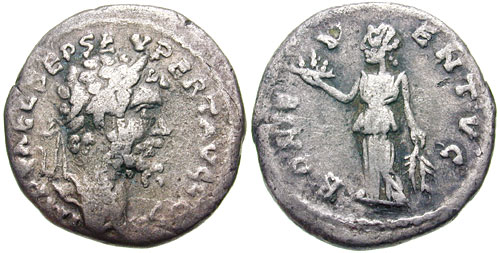 SEV-233   SEPTIMIUS SEVERUS. 193-211 AD. AR Denarius (2.83 gm). Emesa mint. Struck 194-195 AD. IMP CAE L SEP SE-V PERT AVG COS II, laureate head right / BONI E-V-ENTVC (sic), Bonus Eventus standing left holding basket of fruits in right hand, grain ears in left. RIC IV 369 note; BMCRE 343 note; RSC 68 var.  Both RIC and BMC refer to only one specimen in the Reka Devnia hoard.
