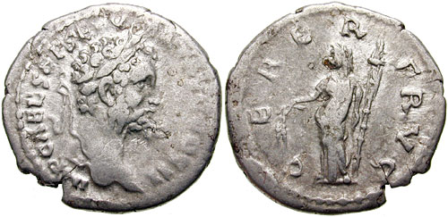 SEV-236   SEPTIMIUS SEVERUS. 193-211 AD. AR Denarius (3.16 gm). Emesa mint. Struck 194-195 AD. IMP CAE L SEP SEV P-ERT AVG COS II, laureate head right / C-ERER FRVG, Ceres standing left, holding grain ears in right hand, torch in left. RIC IV 371; BMCRE 345 note; RSC 69a.
