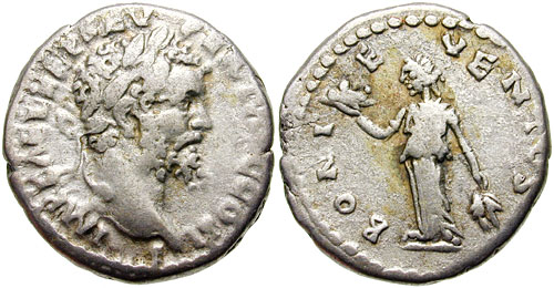 SEV-231   SEPTIMIUS SEVERUS. 193-211 AD. AR Denarius (3.62 gm). Emesa mint. Struck 194-195 AD. IMP CAE L SEP SEV PERT AVG COS II, laureate head right / BONI E-VENTVS, Bonus Eventus standing left holding basket of fruits in right hand, grain ears in left. RIC IV 369; BMCRE 343; RSC 68.