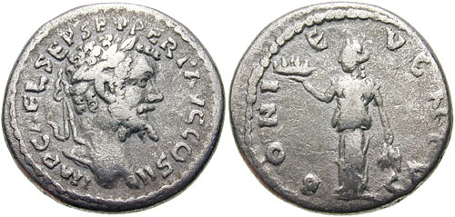 SEV-237   SEPTIMIUS SEVERUS. 193-211 AD. AR Denarius (2.84 gm). Emesa mint. Struck 194-195 AD. IMP CAE L SEV SEV PERT AVG COS II, laureate head right / CERERI FRVG, Ceres standing left, holding grain ears in right hand, torch in left. RIC IV 371 var.; BMCRE 345 note var.; RSC 69a var.