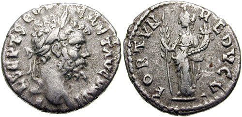 SEPT SEV P-ERET AVG IMP I-I, laureate head right / FORTVN REDVCV, Fortuna