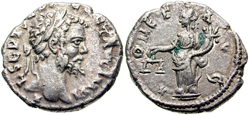 SEPT SEV P-ERET AVG IMP II, laureate head right / MONET AVG, Moneta standing
