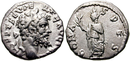SEPT SEV P-ERET AVG IMP I-I, laureate head right / FORT R-DEVC, Fortuna seated